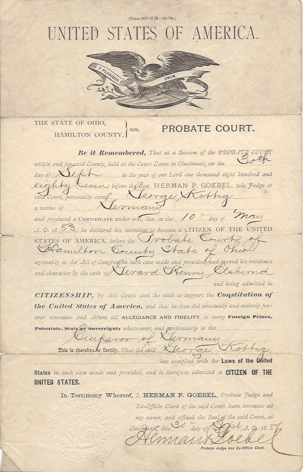 In 1891, at the age of 70, John Kanis I passed. His death certificate stated pneumonia as the cause. Census records from this same period listed John I's address as 917 Vine Street and his occupation as clerk. Seeing that Cincinnati was the third largest city in the United States at the time and that John I was living in the center of town gives us good reason to believe that he probably never worked as a farmer in America.